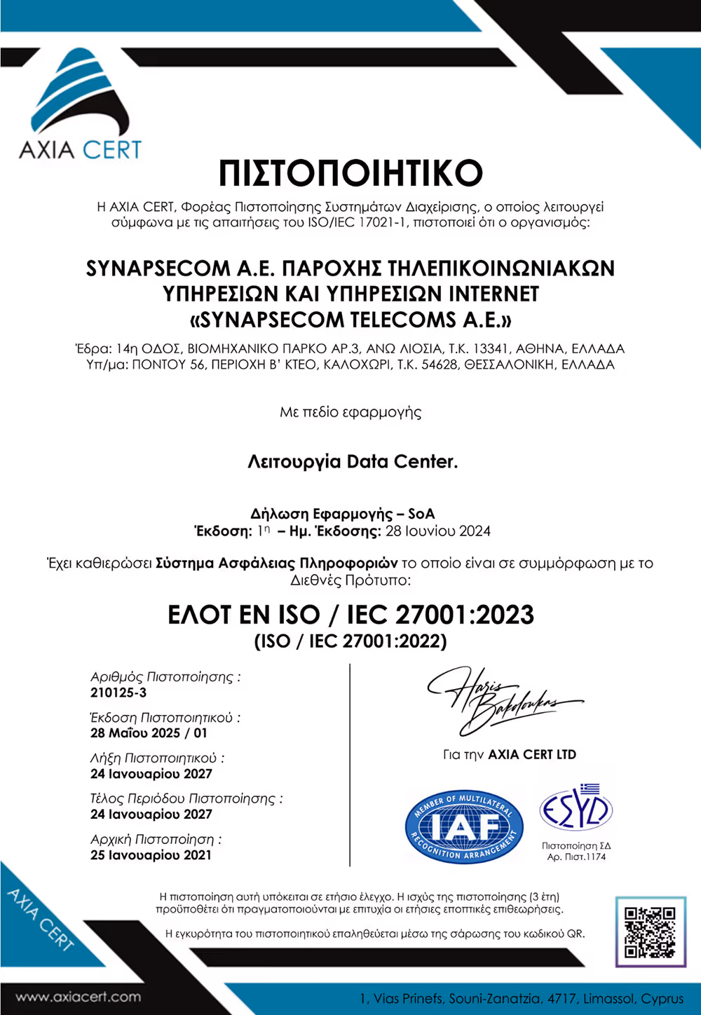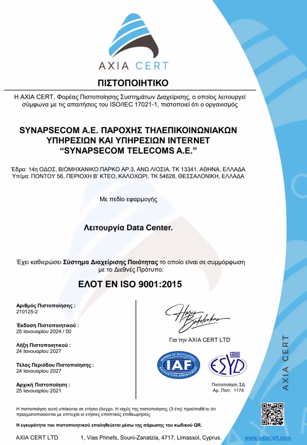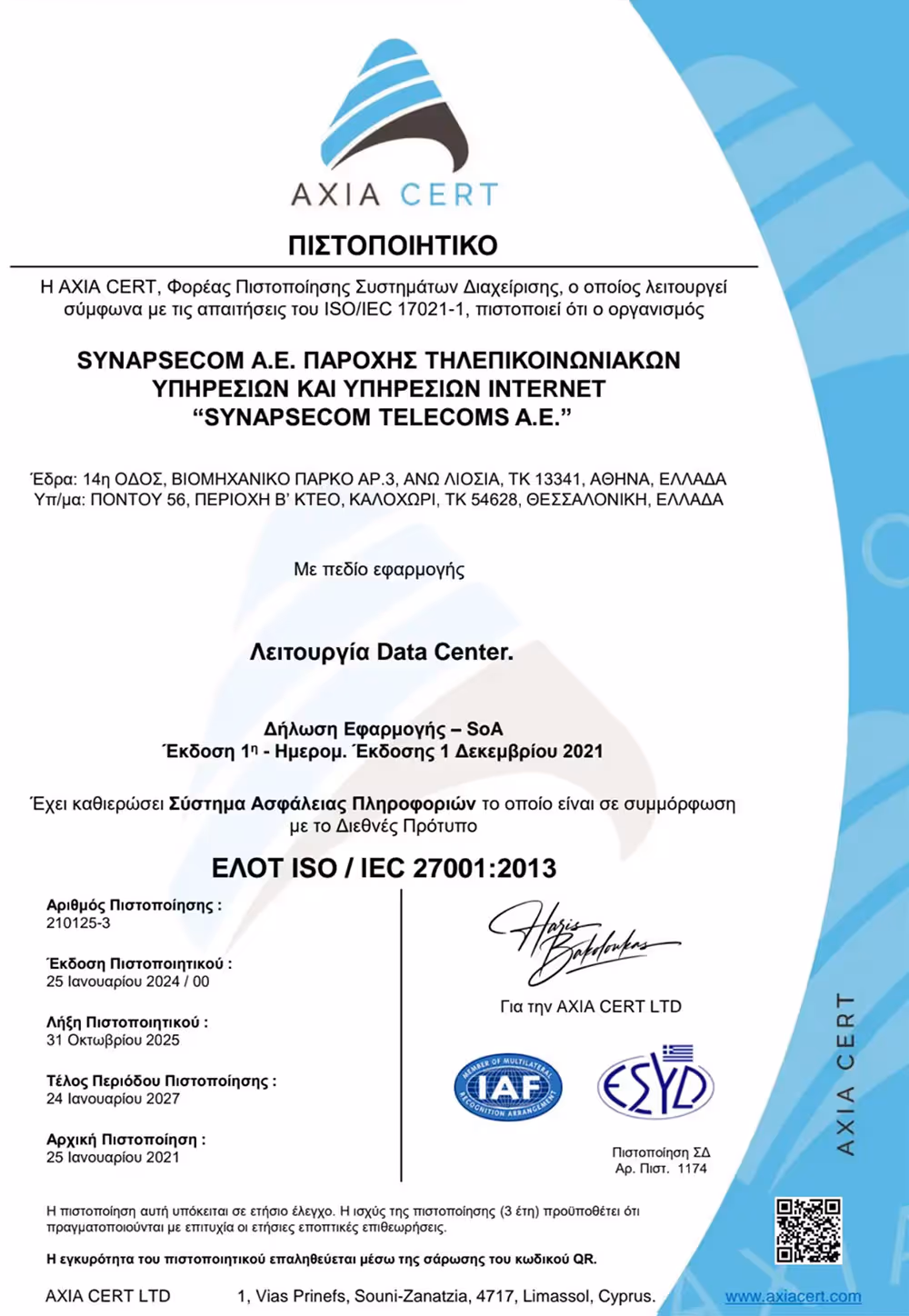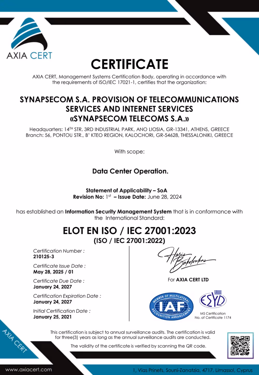 At Synapsecom, certifications are a cornerstone of our commitment to excellence, reliability, and trust. Our data centers in Athens and Thessaloniki operate under internationally recognized standards that ensure the highest levels of security, quality, and operational performance.